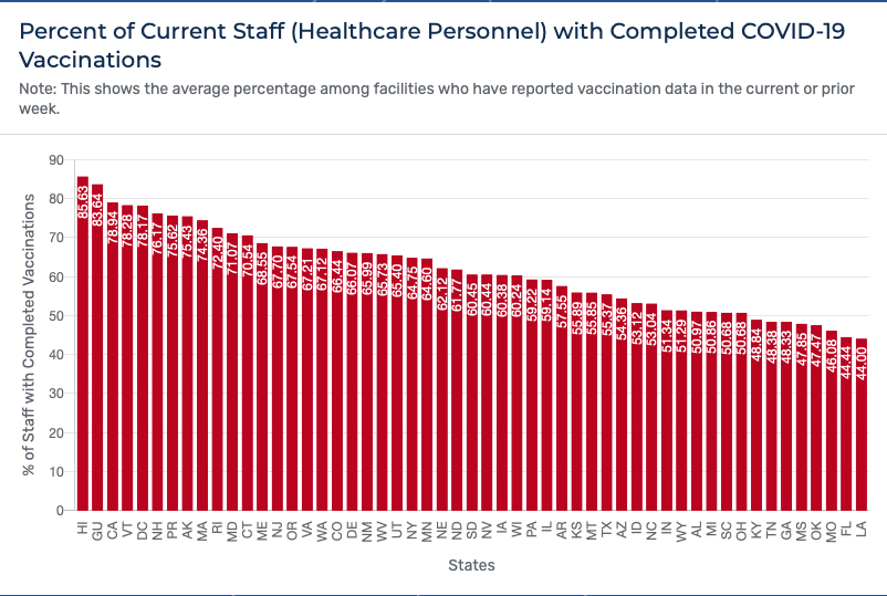 Finally, I think we can all agree that the nursing homes were COVID-19 early “killing fields.” Much like the fires out West, COVID-19 roared through the human “kindling” offered up in facilities that were set up to care for the frailest amongst us. A number of the recent media reports have talked about a 40% non-vaccination rate among healthcare workers. But they are not monolithic, and they can be categorized. In this breakout of data for nursing homes, look at how many of the staff have not been vaccinated. We might quibble about mandates elsewhere, but if you are providing care to our most vulnerable, their right to remain well trumps your right not to be vaccinated – or at least, that is what I, as a physician, believe.