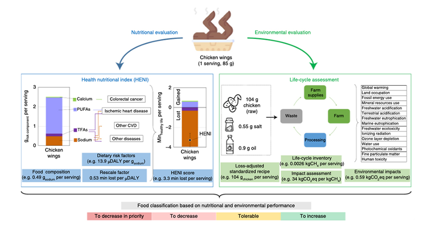 Having re-categorized our food choices' impact on our health, the researchers went on to jostle the standard narrative about the effects of various foods on our environment. Again, it involves mathemagic, in this instance, using studies on the environmental benefit or damage from producing the ingredients in our foods. If you look at the right side of that earlier graphic, you see the environmental impact of the chicken wing.