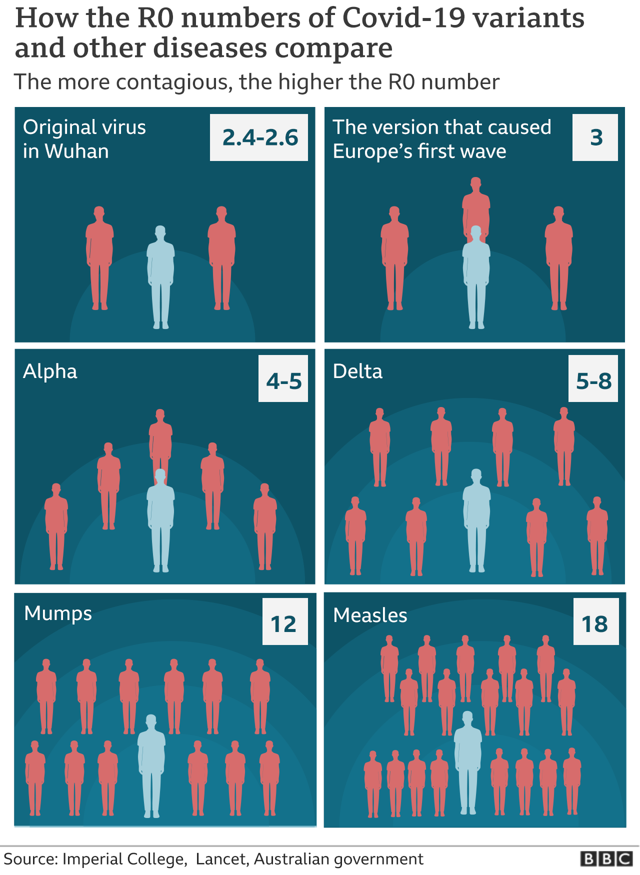 The first is the profile of the virus, which itself has two variables – transmissibility, or infectiousness; and virulence, the severity of illness in people who become infected. The first of these is represented by a variable called R0, or R-naught. As illustrated in the figure below, the Delta variant of the SARS-CoV-2 virus, which causes COVID-19, and which is now dominant in the United States, is more than twice as infectious as the original Wuhan coronavirus, and about half again as infectious as the once-dominant Alpha variant.