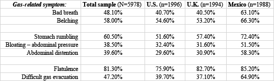Source: Prevalence And Quality Of Life Impact Of Gas-Related Symptoms In The General Population: Findings From A Survey Of The United States (Us), United Kingdom (Uk) And Mexico United European Gastroenterology Conference