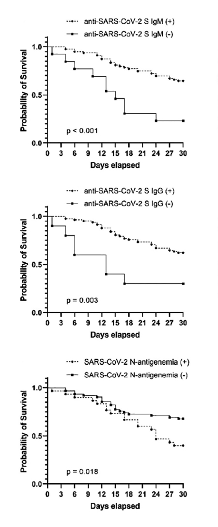 On the right are the survival curves based upon the presence or absence of IgG, IgM, and viral “antigenemia.”
