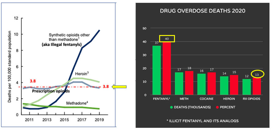 Figure 3 (Right) shows that in 2019 and 2020, prescription opioids ranked fifth in overdose deaths, yet this category is the only one where the term "opioid" is used. We are not having an epidemic of prescription opioid drugs. Perhaps this was accurate a decade ago, but now it is illegal street drugs, primarily fentanyl, killing people. It is both simple and more accurate to call the overdose epidemic in the US a "fentanyl overdose epidemic." Using this term would help remove the undeserved stigma associated with pain pills, immensely benefiting the more than 100 million adult pain patients in the US.