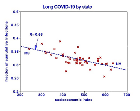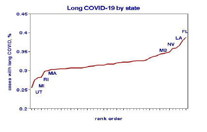 Statistics on the incidence of long-haul COVID are sparse. I found no data on trends, but I found a listing of statewide estimates as of August 2021. [2] I examined them based on per capita rates (mean = 3.4% ranging from 1.3% to 4.4%) or per cumulative COVID cases (mean = 32%, ranging from 25% to 39%).