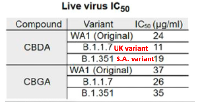 The IC50 is the concentration required to inhibit 50% of viral replication in cells; the lower the number, the more potent the inhibitor. For CBDA against the original Wuhan strain and two early variants, the IC50 ranges from 11-24 micrograms/mL, which equals 31-67 micromolar. The potency of CBGA is a bit less: 73-104 micromolar. But, what do these numbers mean? To put the data in perspective we need to look at the cell-based potency of other antiviral drugs (Table 1).