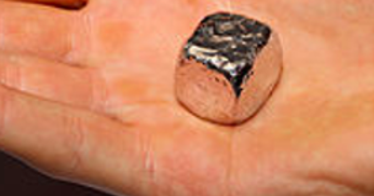 (Left) A 78-gram cube of rhodium is worth $1.3 million. (Right) A sample of rhodplumsite is unremarkable looking but valuable. Images: Wikipedia, Mindat