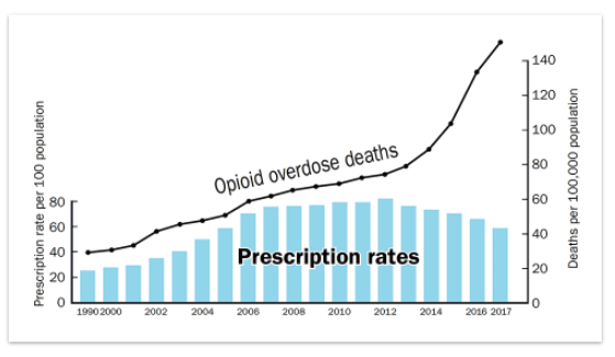 Figure 1. Since 2012 opioid overdoses have been inversely related to rates of prescription of legal pain medications. It does not take a vivid imagination to foresee what will happen if prescription rates are decreased further. Source: Skeptic, CDC.