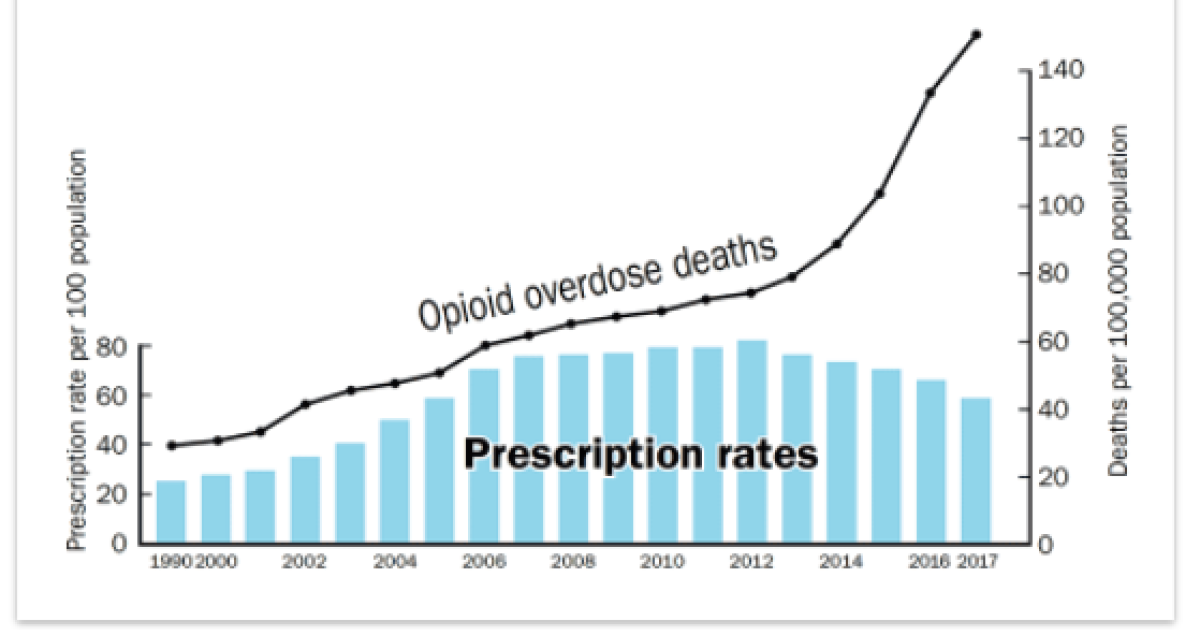 Figure 1. Since 2012 opioid overdoses have been inversely related to rates of prescription of legal pain medications. It does not take a vivid imagination to foresee what will happen if prescription rates are decreased further. Source: SkepticCDC.