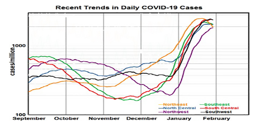 The most important source of temporal variation in 2021 was initiation and deployment of vaccinations, beginning with the primary series of two shots in January and followed by booster shots in the fall. Regional variations in vaccination rates are modest, highest in the Northeast, lowest in the South. Primary vaccination rates leveled off after July, but booster inoculation rates were still increasing in February but reaching only about 25% of the population.