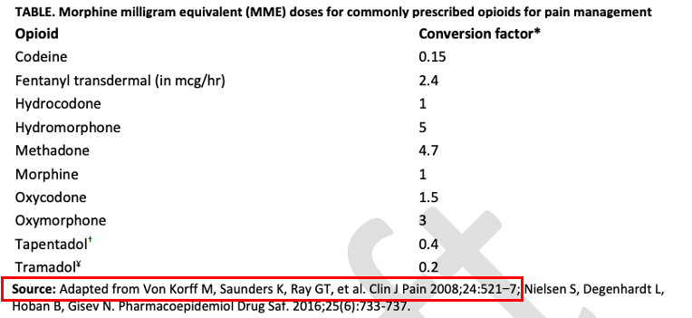 - This table is, at least in part, derived (red box) from a 2008 paper by Von Korff (a co-founder of PROP). The 2008 paper proposes a similar conversion table, but it is based on a collection of small, single-dose studies – a shortcoming recently described by Dasgupta and colleagues in The Clinical Journal of Pain [emphasis mine]: