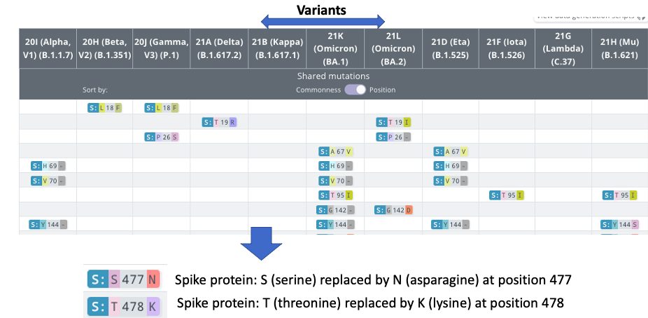 Across the top are 11 variants that have been sequenced. Alpha, Beta...Omicron plus a few others. The little colored boxes show the mutations that occur in each variant. I enlarged two boxes. The top box tells that in position 477 (of 1,273 amino acids that make up the spike protein), the amino acid serine has been replaced by asparagine. Underneath, amino acid threonine has been replaced by lysine at position 478.