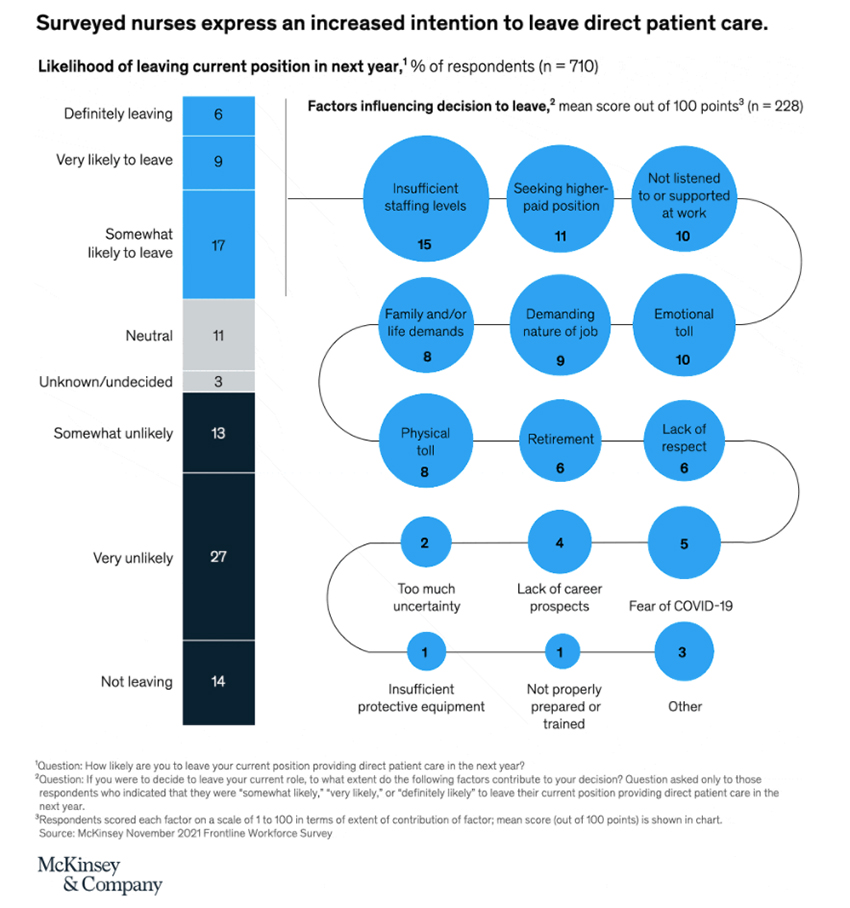 Source: McKinsey and Co, Surveyed nurses consider leaving direct patient care at elevated rates
