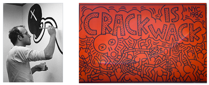 (Left) Keith Haring working on a mural in Amsterdam in 1986. Photo: Wikipedia. (Right) "Crack is Wack" 1986. A New York landmark.