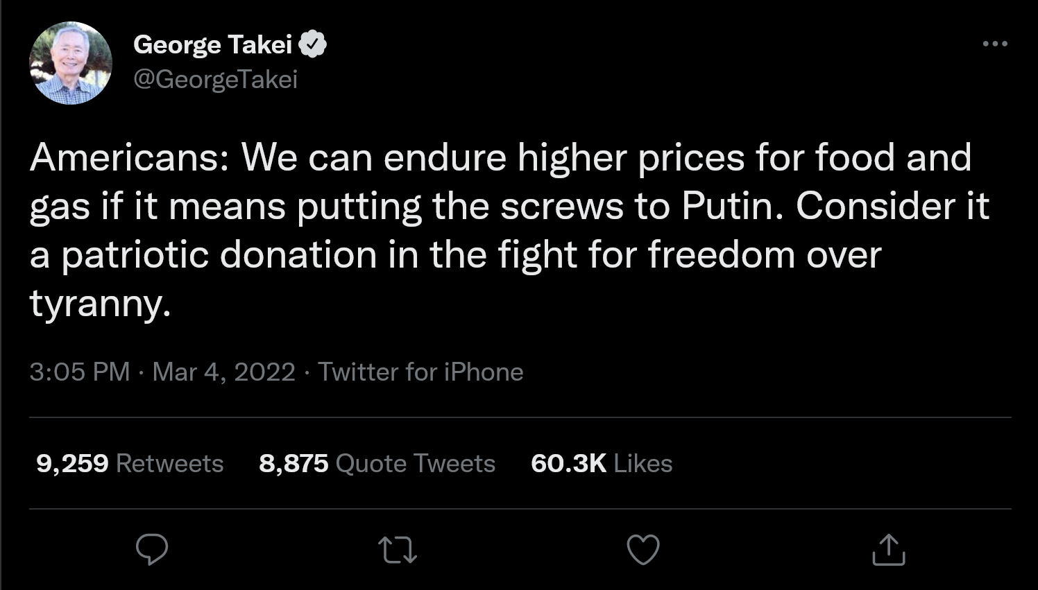The world is in a precarious place. Besides the fact that several thousand people have already been killed and millions more displaced, the war in Ukraine has triggered a trade war that could do severe damage to farmers and consumers around the world. A handful of wealthy celebrities have celebrated this development, urging the rest of us to endure skyrocketing gas and food prices “if it means putting the screws to Putin,” as Stark Trek actor George Takei so unhelpfully put it.