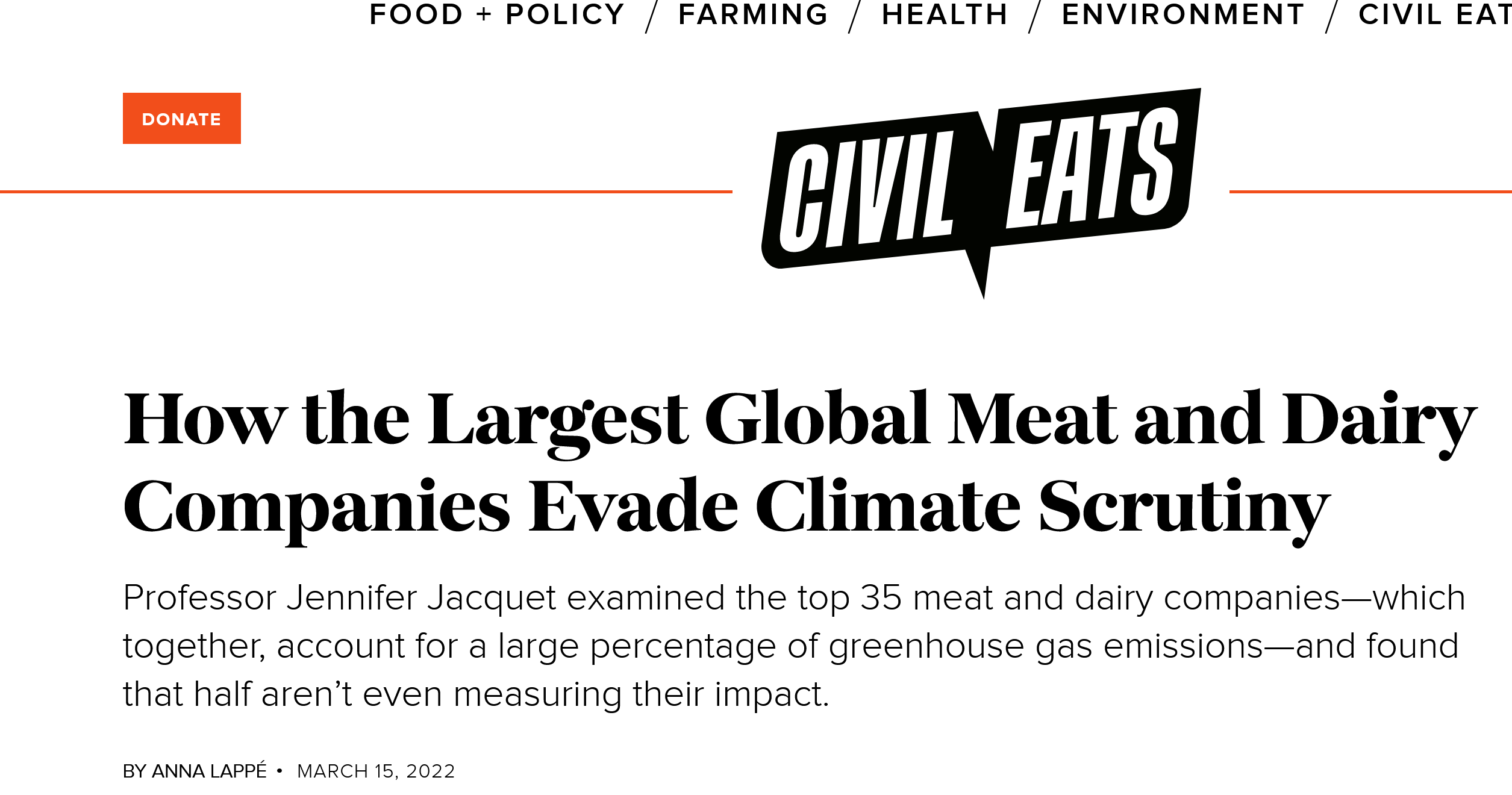 The story was an interview with Jennifer Jacquet, New York University associate professor of environmental studies, and centers around a 2020 study she co-authored, which “set out to explore the climate culpability of the top 35 animal agriculture companies globally in terms of climate impacts ...”