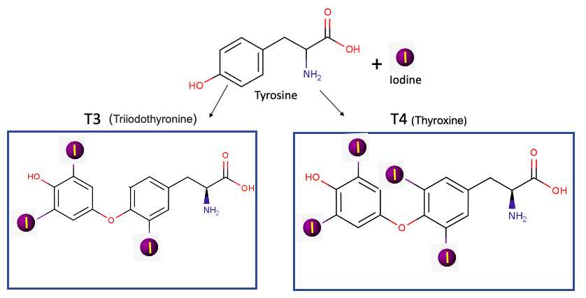 Figure 1. A simplified biochemical pathway showing the conversion of tyrosine (an amino acid) into the two principal thyroid hormones, T3 and T4.