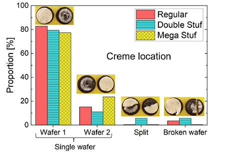 The failure strain, the amount of force involving the breakdown of a material, in this case, the Oreo, is towards the brittle end of the spectrum, like a “crumbly Romano” cheese or foie gras; far greater, double that of peanut butter or crème cheese. While the amount of crème filling measured by its height had no discernable impact on wafer delamination, the filling spread across the wafer required more torque. The filling flavor had no effect.