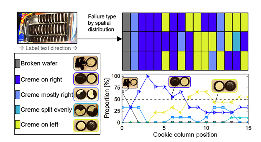 “This may indicate that environmental impacts (ambient heat or mechanical perturbations) influence the cookies in individual boxes, having the greatest influence on cookies near the perimeter. As these influences are uncontrolled by individual consumers, this sensitivity may diminish the predictability of creme failure type and location between different boxes of cookies. … How much this distribution changes between different boxes, cookie types, and season or other environmental impacts, and why, may be a topic for future study.”