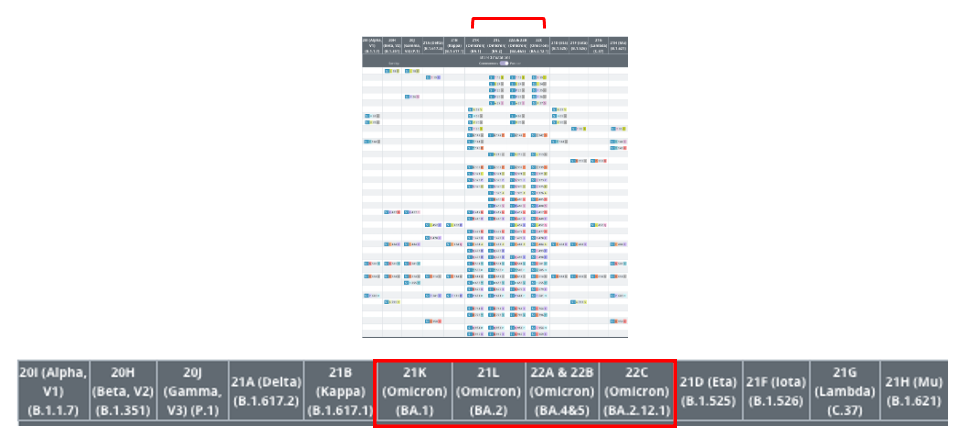 Horror Show Figure 1. Top: Spike mutations found in variants of concern. Each colored box represents a single mutation (see Figure 2 for explanation). Note the stark difference in numbers of mutations in the four Omicron columns (red bracket above, red box below). It is not a coincidence that Omicron, by far the most contagious variant(s) so far, is also the most mutated and by a lot. Underneath I have enlarged the header, which allows you to see the variants you've heard about in the past. Source (for this and all sequencing information): Covariants