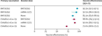 (5) The graph shows the efficacy of three primary vaccines through the Delta surge. Comparing primary doses using the Pfizer vaccines and Oxford- Astra Zeneca, the effectiveness registered 92.5% and 95.3%, respectively, (for Pfizer) and 89% and 91% for (Oxford-Astra Zeneca) as a primary dose followed by boosters of Pfizer and Moderna, respectively. When no booster was administered, the effectiveness was 85.3% where Pfizer was the initial dose, and 71% where Oxford/Astra-Zeneca was the primary vaccine.