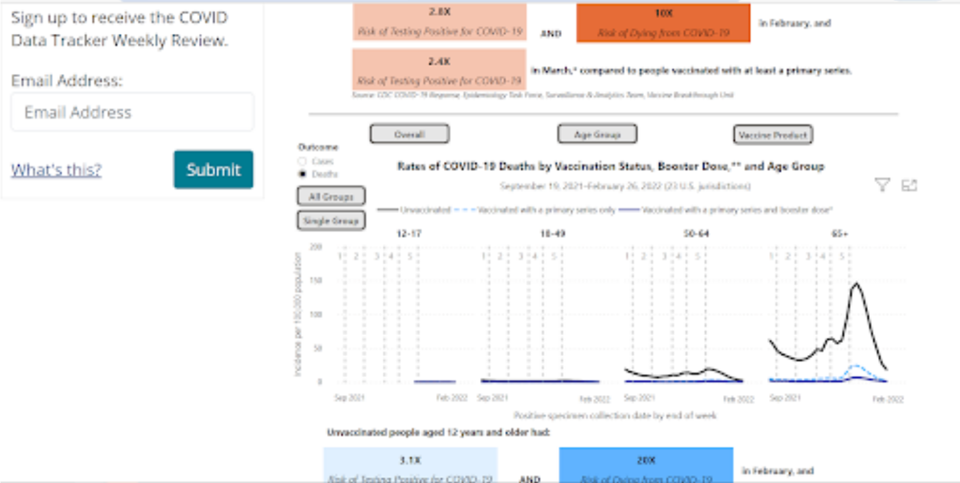 Helpfully, the CDC website does break down this graph by age—an analysis conspicuously missing from the Post “study.” The age demarcation used by the CDC is 65, not 75, the age on which the Post “study” based its initial claim that twice as many vaccinated elderly are dying from Omicron vs. Delta.