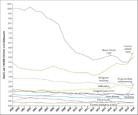 The most recent CDC compiled data demonstrates that as of 2020, firearm-related injury became the leading cause of death for children aged 1-19, with most over 14 overtaking car crashes.