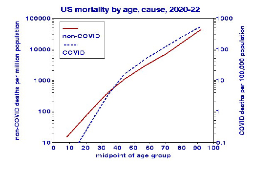 Health effects on the elderly have been emphasized during the pandemic; however, such health effects, especially mortality, tend to be higher for all causes, not just COVID. In this analysis, we focus on differences between COVID and non-COVID deaths, expressed as relative risk ratios of COVID mortality, where non-COVID deaths are defined as total death counts less COVID death counts. The pandemic may have also increased non-COVID deaths by virtue of treatment delays. [3]