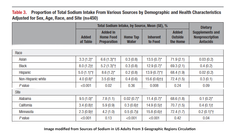 But the salt added at the table and during home preparation, the amount added for taste, and the amount added because of the cultural norms of cuisine show significant variation. Southern tastes require more salt, less so for the Midwest. Black and Hispanic cuisine involve more salt, but it is added during cooking in one instance and in the other at the table.