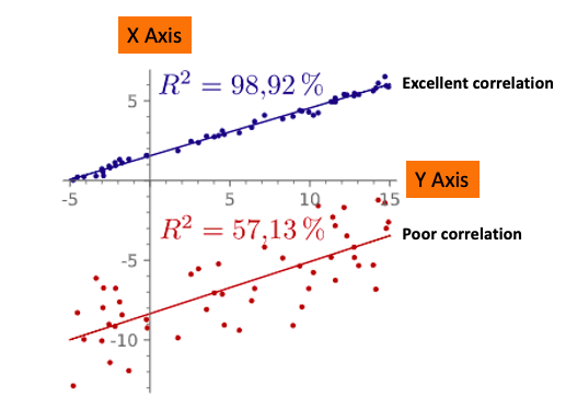 Two graphs, one (blue) with an excellent correlation of the two variables, and one (red) with a poor correlation. The R2 figure (98.9%) tells us that the two variables are highly correlated, which is also seen by how close the data points fit a line. The data points in the red graph fit the line poorly and this is reflected in the lower R2 value of 57.1%. Original image: Wikipedia.