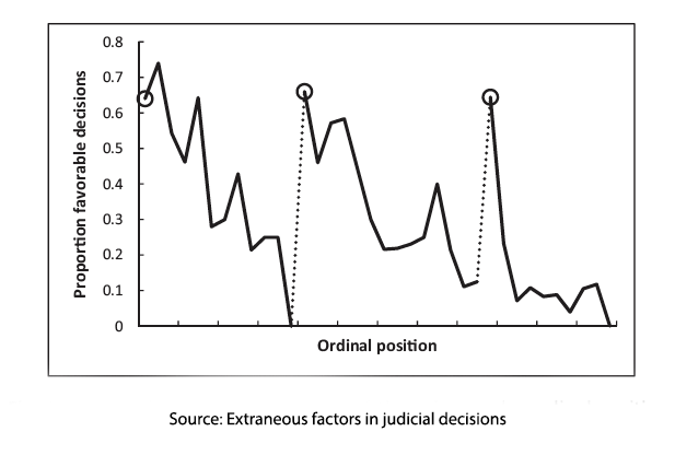 Ordinal position refers to the time of day, early to the left, late to the right. Those circles reflect breaks taken by the parole judge for snacks and lunch, lasting about a half-hour. As you can see, your best chance of being paroled was early in the day or just after a meal and break. The researchers mused that: