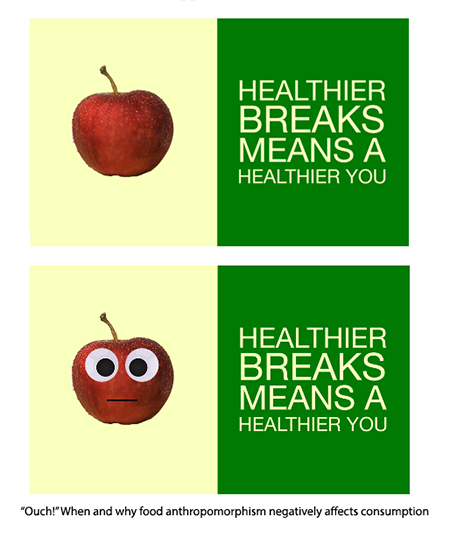 The first made use of the apples depicted on the right. One hundred eighty participants recruited through Amazon’s Mechanical Turk were shown either the plain apple or the one with the eyes and mouth. After controlling for the participant's “self-reported” state of hunger and neutral feelings towards eating apples, the researchers found “desire to eat an apple was reduced after being exposed to an advertisement featuring an apple with (vs. without) humanlike characteristics.”