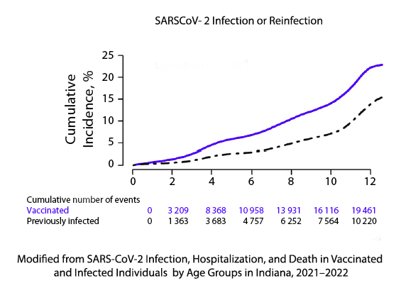 Naturally acquired immunity was more protective than vaccine-acquired immunity from infection. You can see the numbers of infected or reinfected in the case of naturally acquired immunity over 12 months. A ready explanation may simply be that naturally acquired immunity has more targets than the surgical precision of our mRNA vaccines. And a quick word of caution, the members of the naturally acquired immunity cohort had survived their COVID infection; everyone is not so lucky.