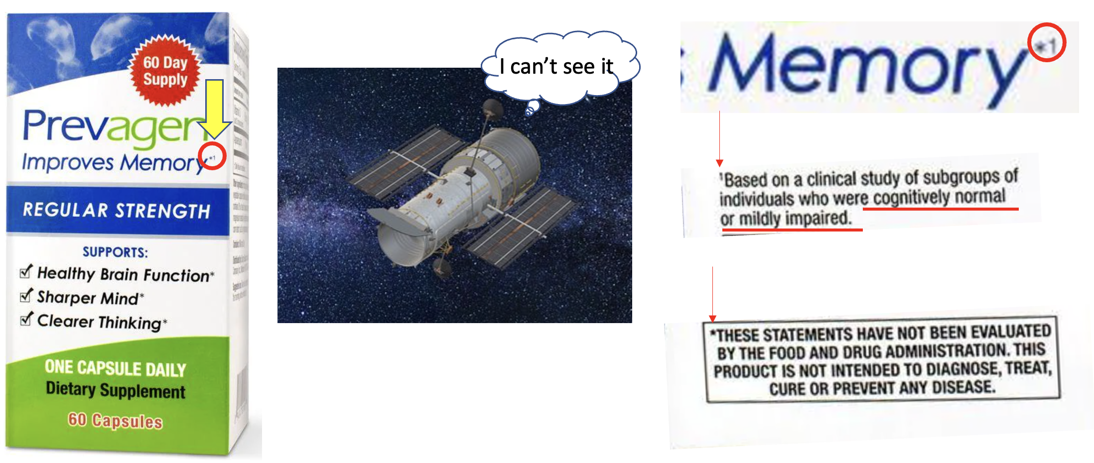 Prevagen's scheme begins in the drugstore. (Left) A screenshot of the front of the box. Lots of promotional BS but what's that muon-sized speck in the red circle? (Middle) I was able to get some time on the Hubble Telescope but it didn't help. (Right) After blowing it up a bazillion times I was able to see what those accidentally atom-sized symbols meant. At the bottom is the standard dietary supplemental double talk. But above it is something rather interesting. The clinical trials (which I'm sure were awful) provided some interesting information: the stuff was only tested on people with normal memories or were "mildly impaired." That's pretty much like testing a toaster by putting in toast to see if it makes toast.