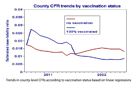 We examined temporal relationships in the average CFRs across the 99 counties and the cross-sectional relationship among the 99 counties at a specific time. We replicated the latter regression for each of the months of 2021-2 and plotted the CFR intercepts, and estimated full vaccination CFRs as a space-time analysis. CFRs with no vaccinations were essentially constant over time.