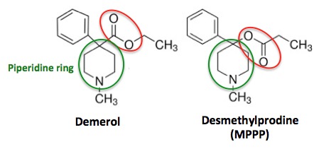 Why is this quote so intriguing? Because it's happened before, albeit under different circumstances. And the culprit was indeed "some kind of chemical," but it wasn't alcohol or anything in the environment. In 1982 a group of heroin addicts who injected a bad batch of an analog of Demerol developed severe Parkinson's symptoms – in days, not years. The drug, which is called MPPP was contaminated with a highly neurotoxic impurity and the results were both astonishing and horrifying. The incident can be traced back to 1976 when a graduate student made a bad mistake in the lab. There is even a book about the incident, although the author gets the chemistry wrong.