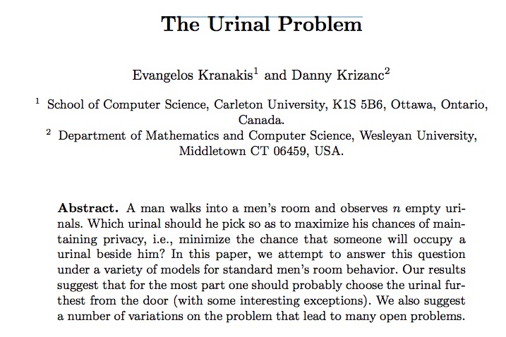- Two scientists at respected universities in two North American countries collaborated to answer the age-old question: "What is the pattern of urinal selection in the men's room?"