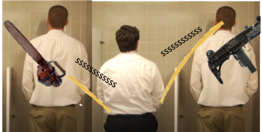 If not already obvious, the authors are suggesting that distance between urinators is of paramount importance. This can be a matter of self-preservation, especially if your technique is faulty...