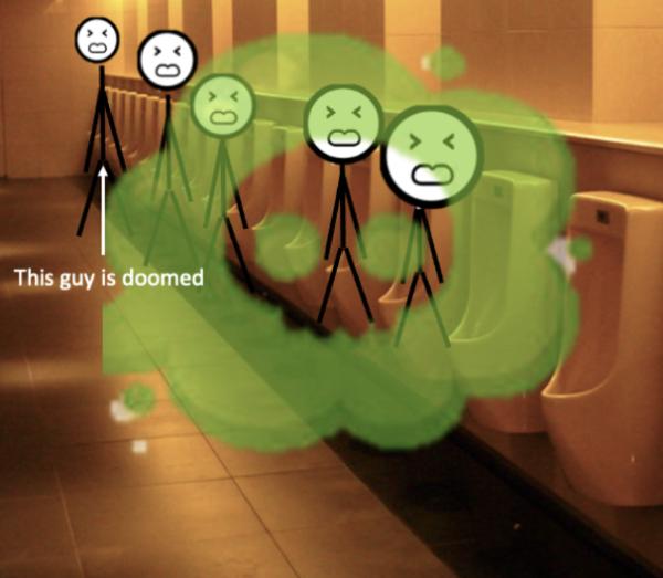 Translation: Men generally don't want to look at each other's wieners when peeing and will select the furthest urinal from others.