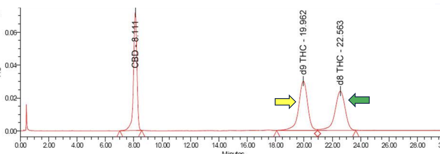 Figure 1: Upon exposure to simulated gastric fluid (SGF) CBD is converted into both delta-9-THC (yellow arrow) and delta-8-THC (green arrow) after 75 minutes. Source: "Identification of Psychoactive Degradants of Cannabidiol in Simulated Gastric and Physiological Fluid." Merrick, et. al., Cannabis and Cannabinoid Research Volume 1.1, 2016 DOI: 10.1089/can.2015.0004 (peer-reviewed)