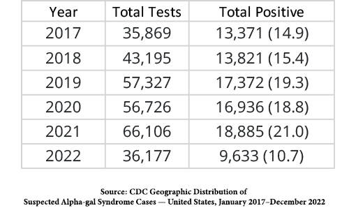Source: Geographic Distribution of Suspected Alpha-gal Syndrome Cases — United States, January 2017–December 2022 CDC Morbidity and Mortality Weekly Report (MMWR)