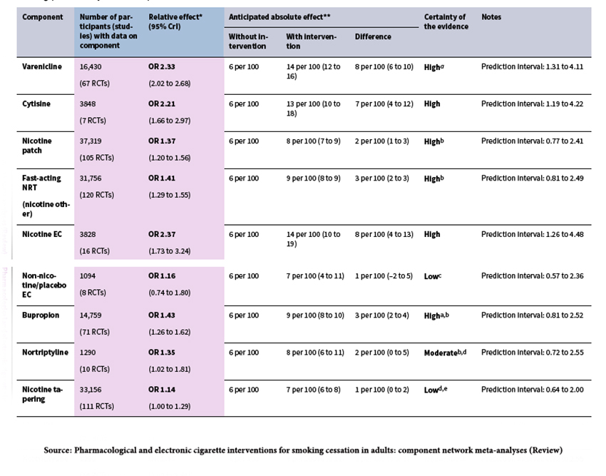 Source: Pharmacological and electronic cigarette interventions for smoking cessation in adults: component network meta-analyses (Review) Cochrane Library