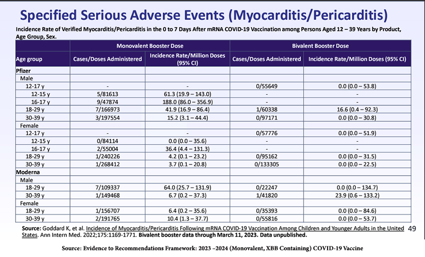 There is an increase in post-vaccination myocarditis and pericarditis, especially in males 16-17, and more from the Pfizer product than Moderna’s. Males aged 30-39 seemed more affected by the Moderna bivalent booster. We have learned that the incidence of myocarditis can be reduced by longer intervals between doses and by individualizing which of the mRNA vaccines is given.