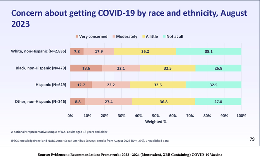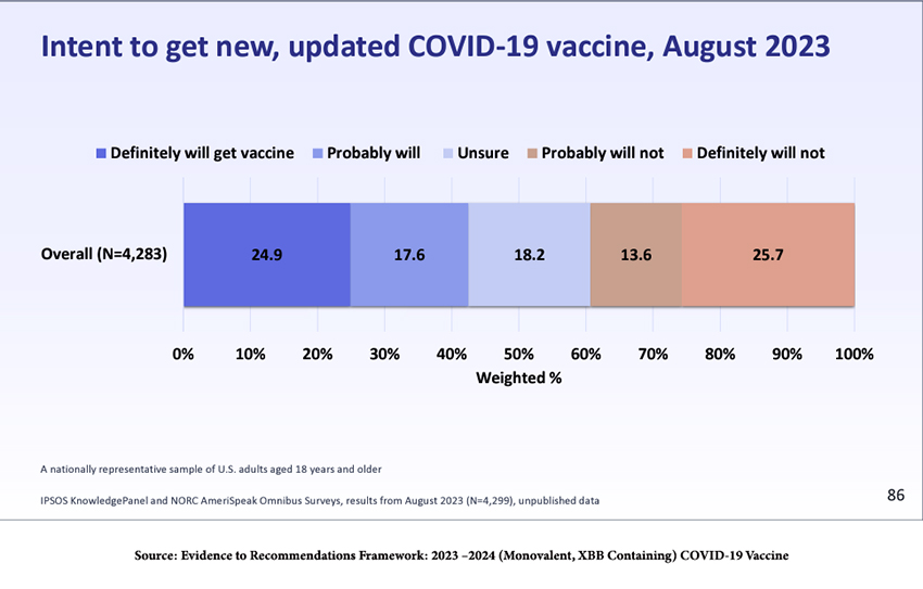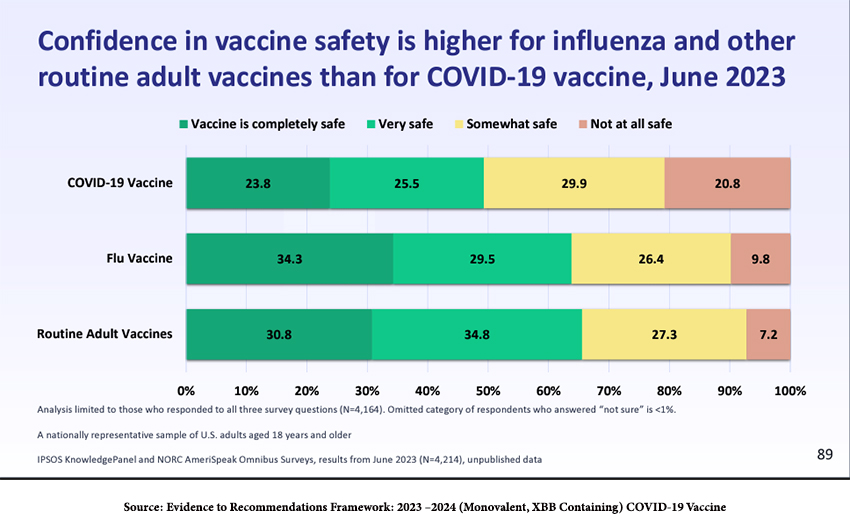 “A June 2023 survey of just over 4,000 adults showed that confidence in vaccine safety is higher for influenza and other routine adult vaccines than for COVID shots. Data from that same survey showed that healthcare providers had far lower rates of recommending COVID shots compared with flu or other routine vaccines: 56.2% for COVID versus just above 60% for shingles and pneumonia, and about 72% for flu.” [emphasis added]