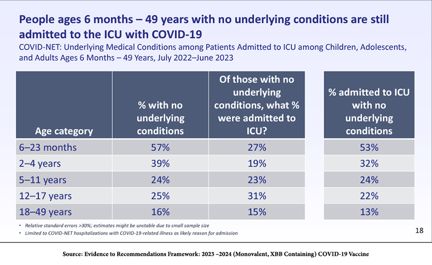 As the table shows, although most young children have no comorbidities, many become seriously ill and are admitted to the ICU.