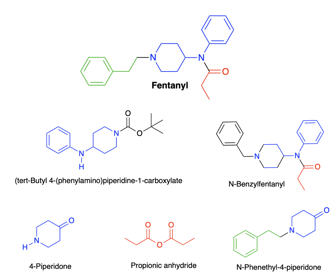 Of the 39 List 1 chemicals (3), five chemical reagents or intermediates are used to synthesize fentanyl (Figure 2). The colors of the fragments of fentanyl correspond to those same fragments in the chemicals used to make the drug. Although there are multiple ways to synthesize fentanyl, there can be little doubt that if the chemicals in Figure 2 are difficult to get, fentanyl production will suffer.