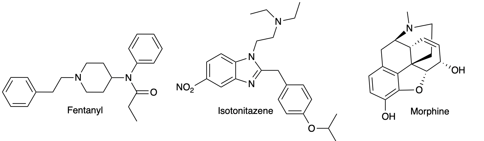 Figure 1. Although fentanyl, isotonitazine, and morphine are all opioid receptor agonists, they have nothing in common chemically, so they must, by definition, be synthesized from completely different chemical building blocks (starting materials and intermediates).