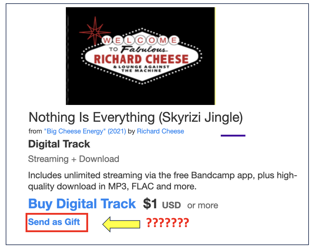 OMG. On Cheese's Bandcamp site, you can buy (and send, presumably, to your worst enemy) the Skyrizi jingle! Is there anyone you despise enough to do this to?