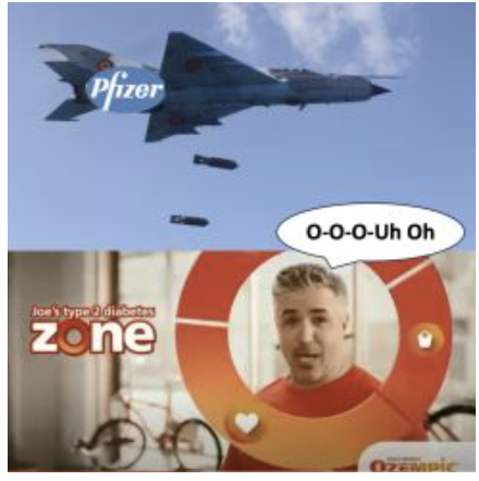 Many people think the O-O-O-Ozempic ad is an appalling abomination that cannot be outdone. I took a shot at it in May 2023 after Pfizer announced that it was investigating an orally active GLP-1 agonist that could threaten the market share of injectables, such as Ozempic and Wegovy. It was only fitting that I orchestrated a Pfizer bombing campaign against Joe (below), who was smugly celebrating his entry into the "Tri-Zone," perhaps a bit prematurely.