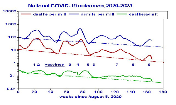 Conventional wisdom holds that COVID peaks may be attributable to new variants. The numbers within the graph correspond to the timeline of the various vaccinations and booster shot programs. With the introduction of the vaccine (point 2) and the subsequent boosters (point 4 and 7) COVID admissions and deaths declined. Increases in these outcomes are presumed due to new virus variants, especially the Omicron variant at about week 55 (August 2021). The prognosis for the remainder of 2023 remains unclear.