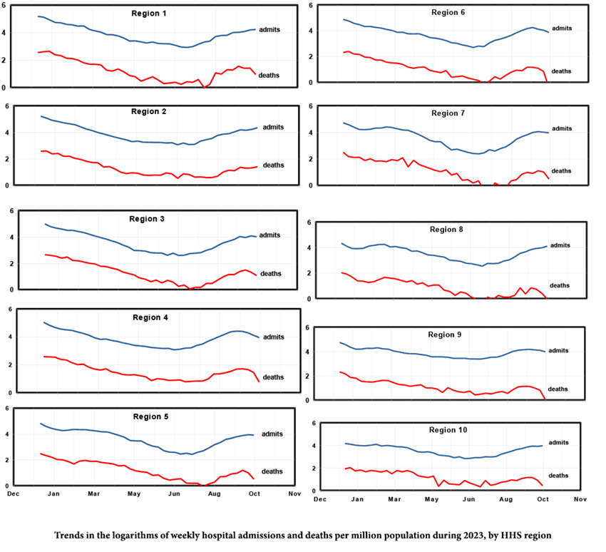 To highlight regional similarities and differences, we present the 2023 trends as outcomes per million population on a logarithmic scale.