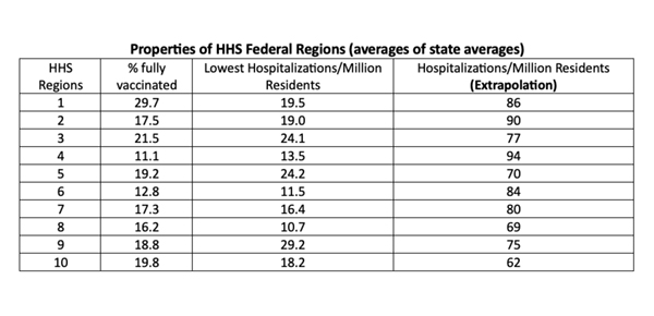 - Region 4 (Alabama, Florida, Georgia, Kentucky, Mississippi, North Carolina, South Carolina, and Tennessee) has the lowest vaccination rate, the highest at-risk population, and the highest extrapolated hospital admission rate. But Region 1 (Connecticut, Maine, Massachusetts, New Hampshire, Rhode Island, and Vermont) and Region 2 (New Jersey and New York) also have high extrapolated hospital admission rates.